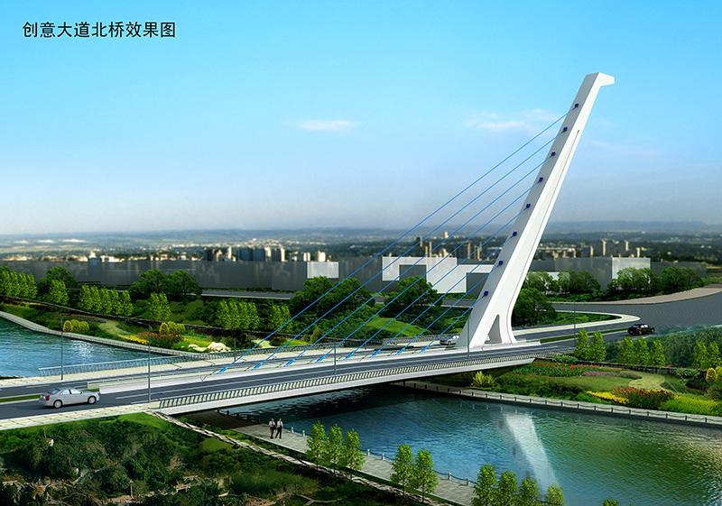 匯智橋路南、北橋均為無背索獨(dú)塔單索面斜拉橋,橋跨 82 米,全寬 33.5 米;智力島路橋?yàn)閱慰缧滦托笨渴焦?/span>
